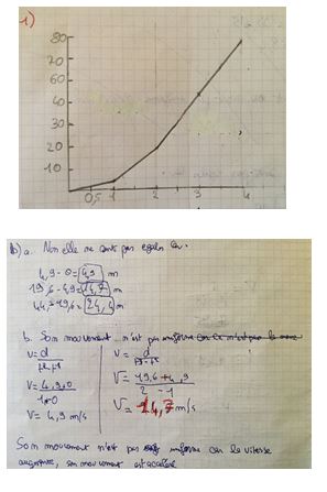 1- Pour répondre à la question sur l'uniformité du mouvement, le calcul de la vitesse n'est pas obligatoire puisque juste avant vous avez montré que sur des intervalles de temps égaux, la distance parcourue n'était pas toujours la même, cela implique d'après la relation d= v*t que la vitesse n'a pas toujours la même valeur donc le mouvement n'est pas uniforme; Vous pouvez ensuite préciser que sur les positions étudiées ici, la vitesse ne cesse d'augmenter donc le mouvement est accéléré.