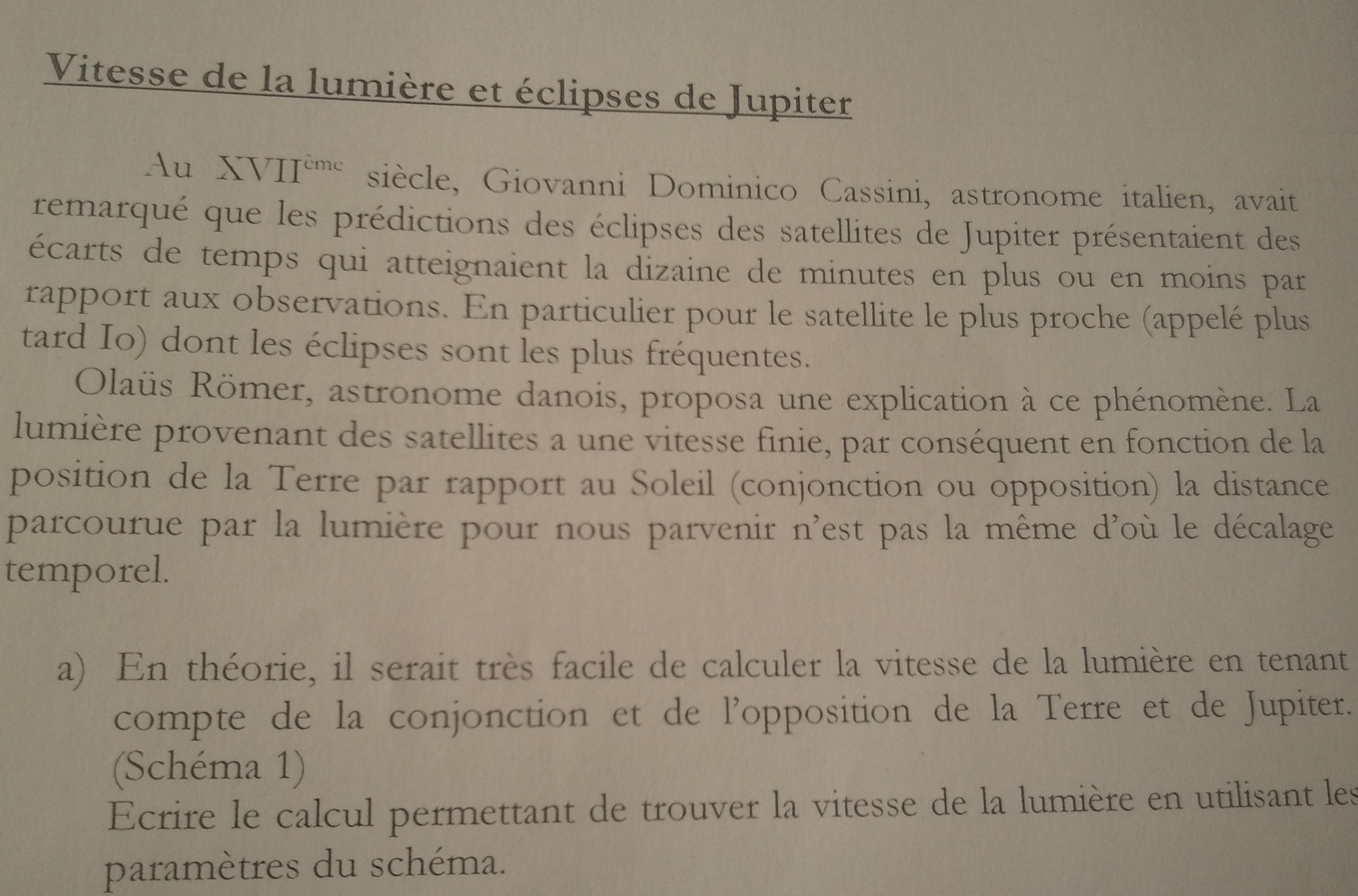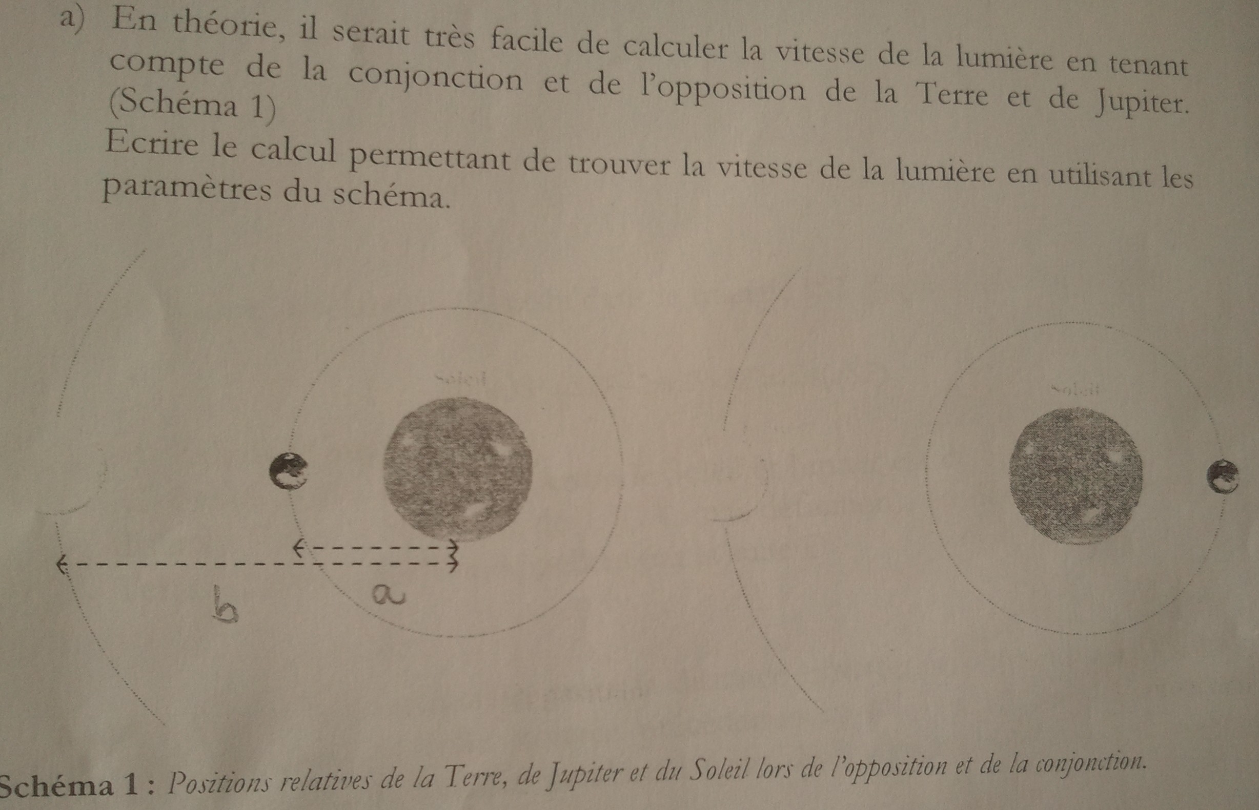 Je connais la vitesse de la lumière (300 000 km/s) mais dans la question, Römer de savait pas que la vitesse de la lumière est égale à 300 000 km/s. Et je dois trouver le calcul qu'il avait fait pour connaitre ce cette vitesse, grâce aux données de ce schéma mais voila, je bloque sur ce schéma et le peu de donné qu'il présente.