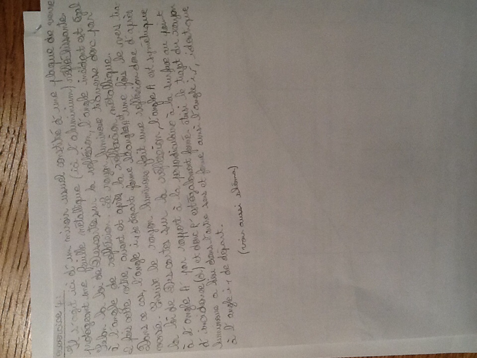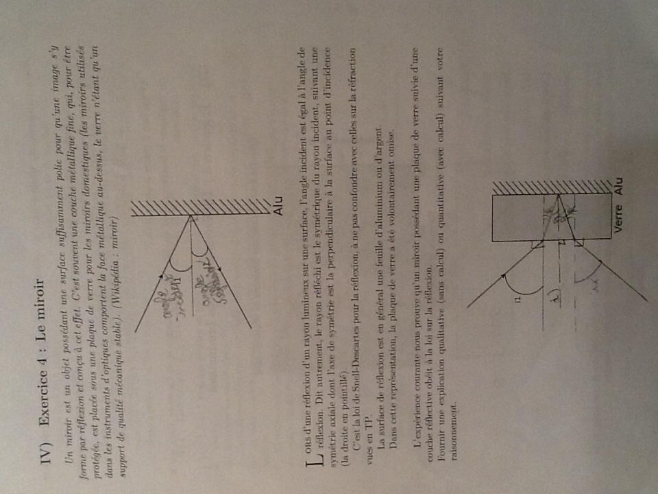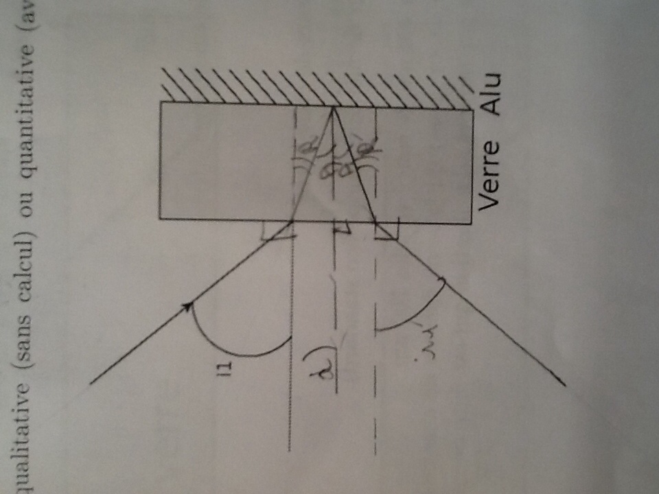Vous auriez pu développer plus longuement ce qui se passe lorsque le rayon incident passe de l'air au verre (c-à-d lorsqu'il y a réfraction) et faire de même pour l'autre réfraction (passage du verre à l'air) qui a lieu après la réflexion sur l'aluminium.