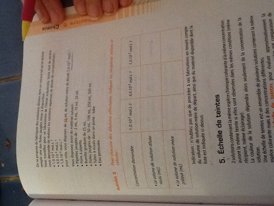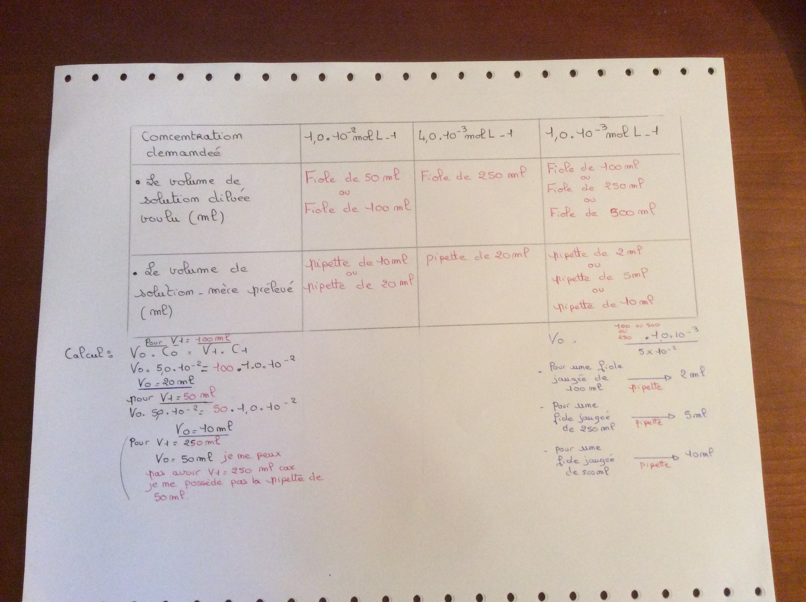 Il faut faire de même avec les autres solutions en tenant compte de la verrerie, pipettes jaugées et fioles jaugées, à disposition.