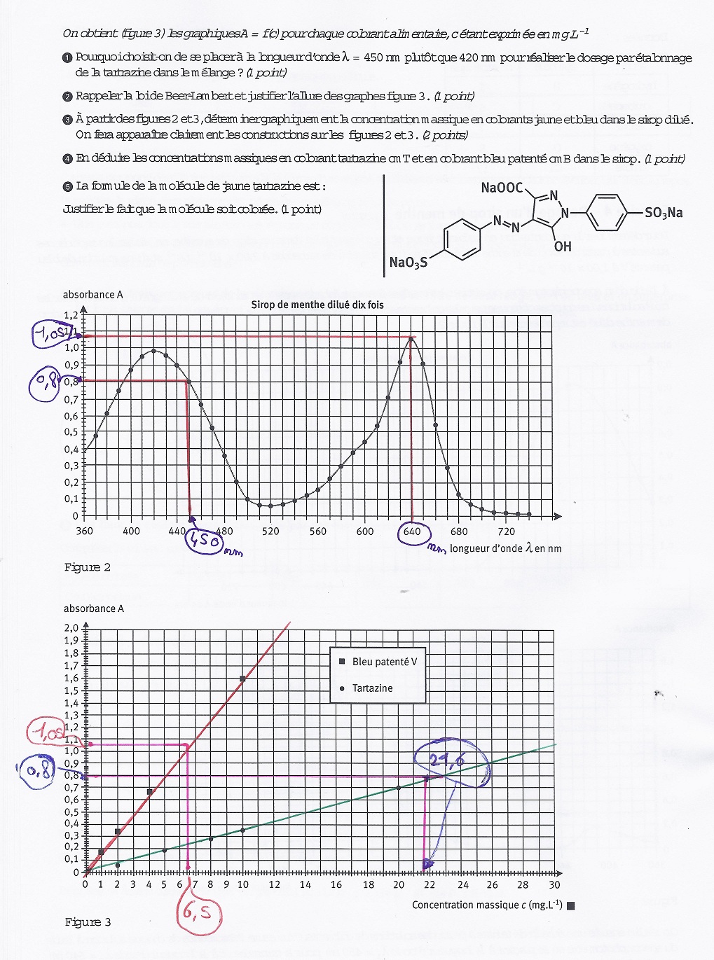l'absorbance de la tartrazine est grande et à peu près la même à 420 nm et 450 nm tandis que l'absorbance du bleu patenté est faible mais n'est pas nul à 420 nm ; par contre elle est nulle à 450 nm.