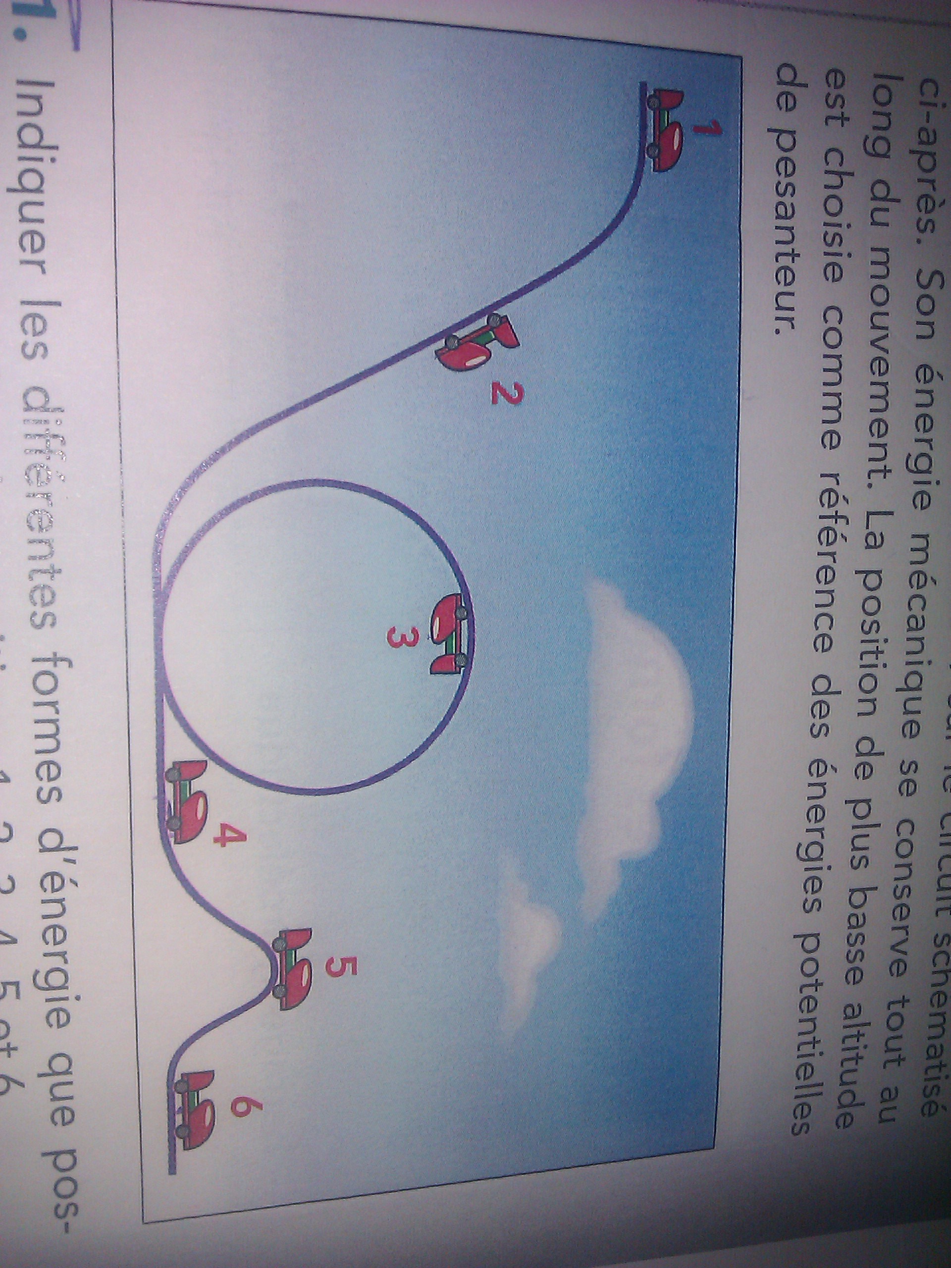 2. Au début le chariot a de l'altitude mais pas de vitesse, il a donc de l'énergie potentielle puis il prend de la vitesse, il acquit alors de l'énergie cinétique qu'il garde jusqu'à la position 4 où il a perdu de l'altitude. A la position 4, le chariot n'a donc que de l'énergie cinétique. Puis il reprend de l'altitude et gagne ainsi de l'énergie potentielle qu'il reperd a la position 6 où il n'a plus d'altitude.