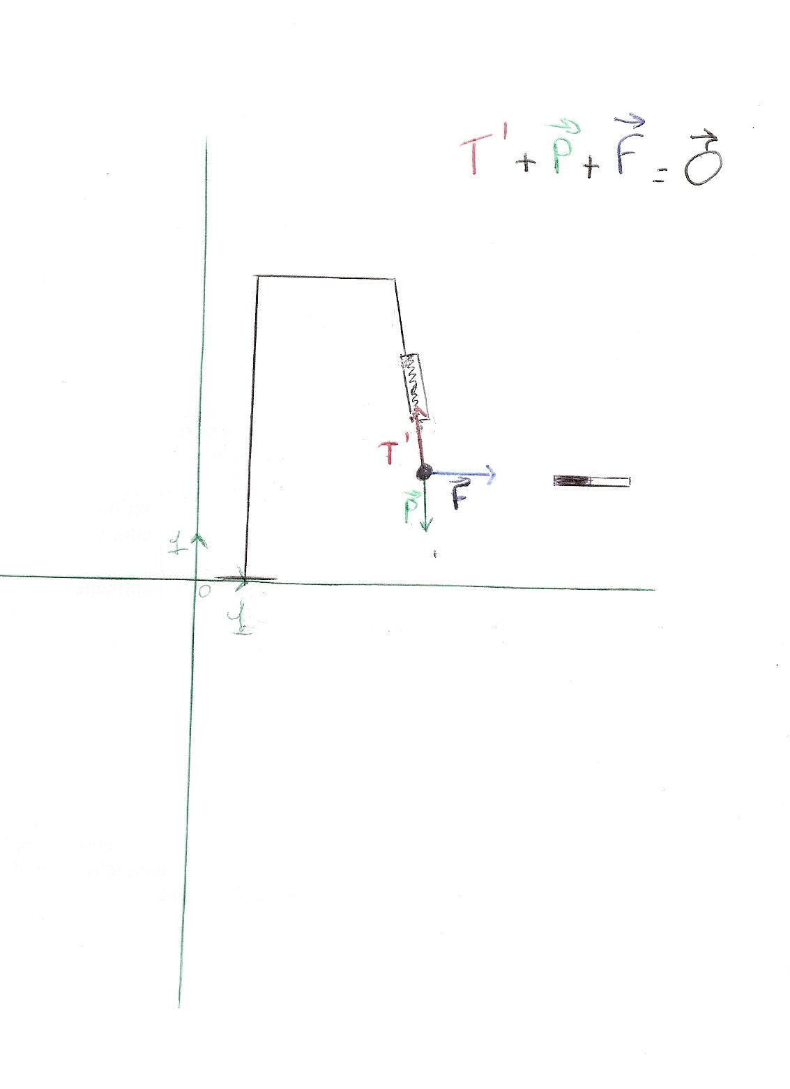 Pour le reste, votre schéma est un bon début mais la représentation des vecteurs force est incorrecte : ils ont la bonne direction mais pas la bonne longueur. En effet, d'après votre relation (j'écris les vecteurs en caractères gras) F + P = - T' et d'autre part, ce que vous savez sur la somme de deux vecteurs entraine que la disposition de ces vecteurs les uns par rapport aux autres est particulière : à vous de la trouver et le schéma sera juste !