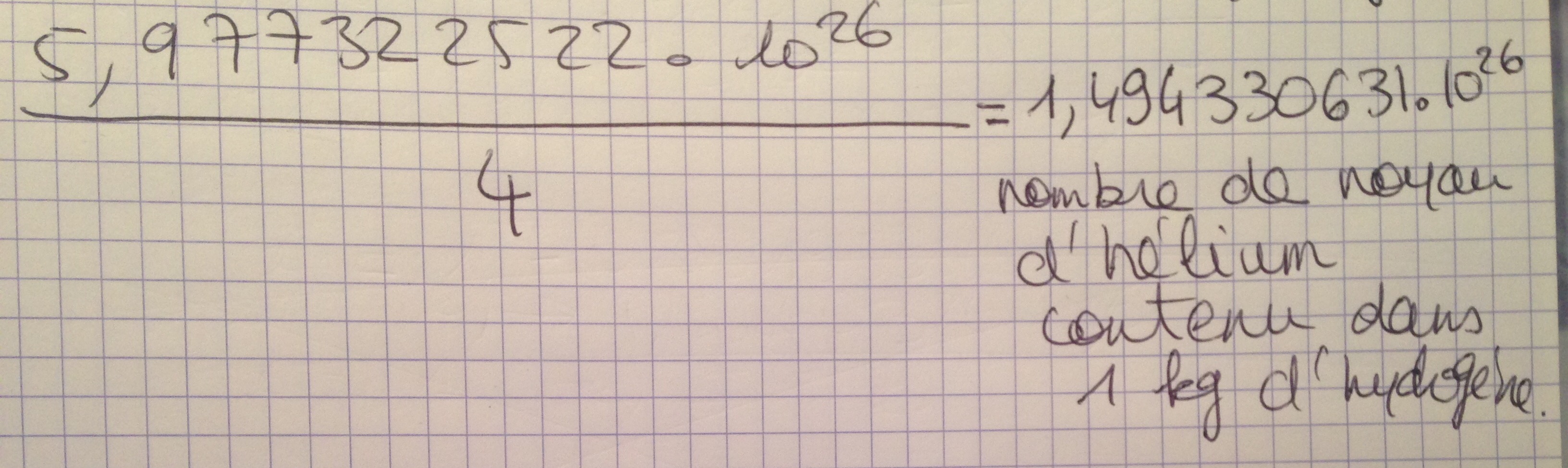 Pour la fin, faites attention, il vous a fallu 4 protons pour former un seul noyau d'hélium. Vous devez calculer le nombre de noyaux d'hélium formés à partir du nombre de protons que vous venez de calculer.