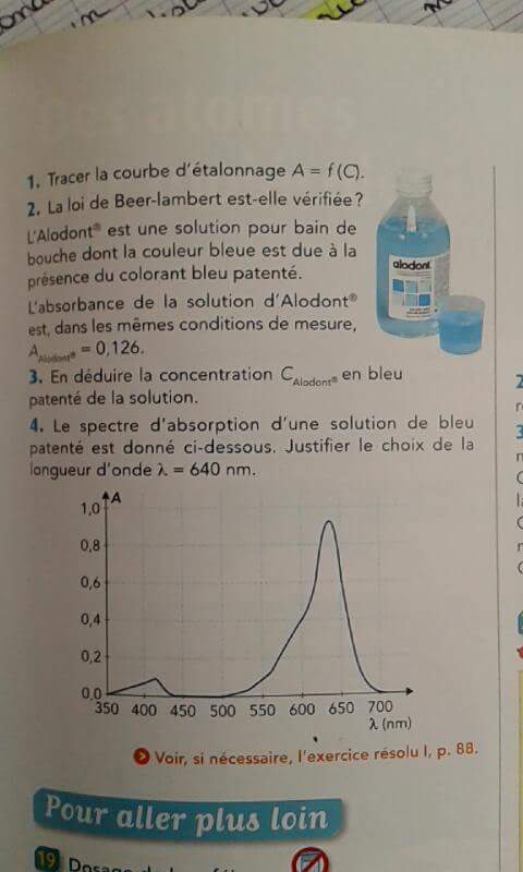 Le petit 4, j'ai mis : La longueur d'onde lambda max correspond à l'absorbance max Amax de la solution. La couleur complémentaire d bleu est le juane avec pour longueur d’absorption lambda = 620nm d'où on a choisit lambda = 640nm.