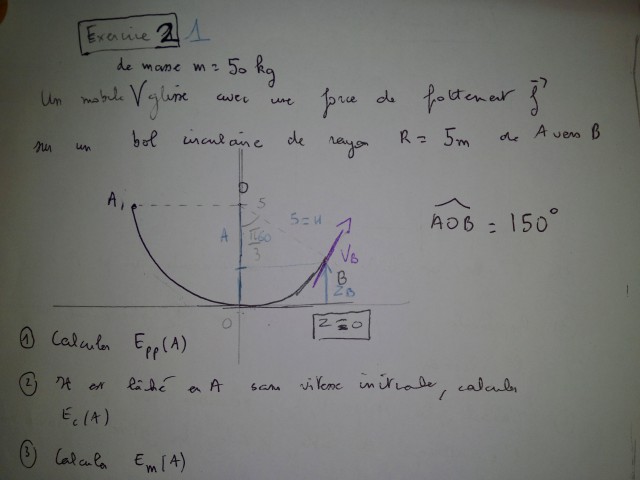 un mobile de masse m = 50 kg glisse avec un force de frottement f sur un bol circulaire de rayon R = 5 m de A vers B.