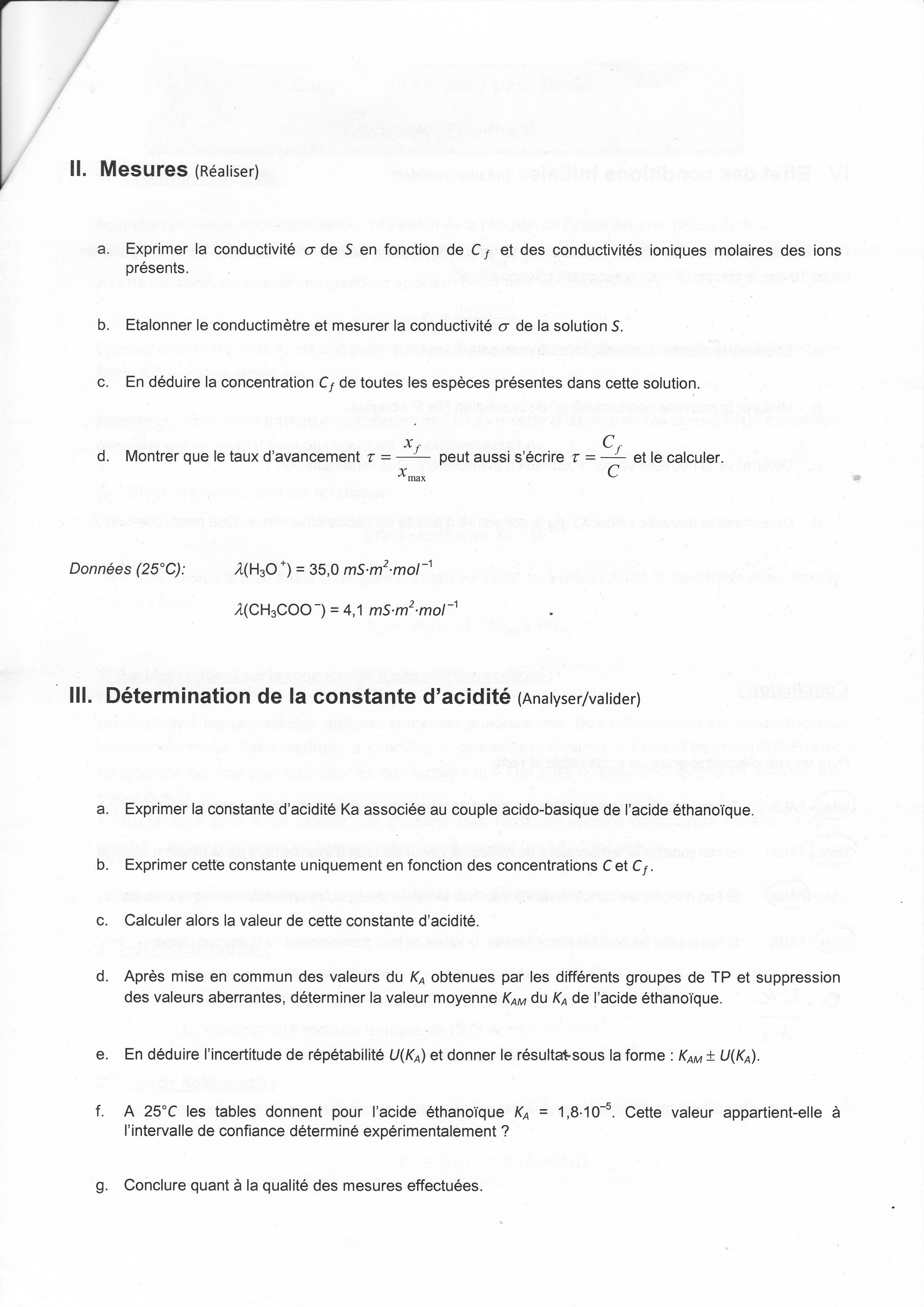 J'ai 4 questions à faire (d,e,f,g) sur la constante d'acidité ( Partie III de l'énoncé )