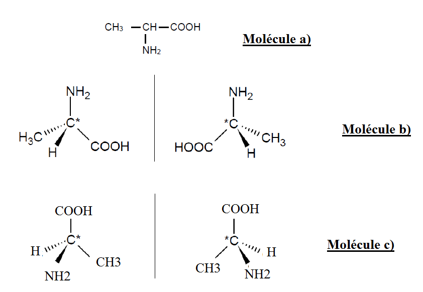 Votre réponse n'est pas correcte, la molécule représentée en (c) est identique à la molécule en haut à gauche (molécule (a) ?). Pour ne pas vous tromper, il suffit de considérer la molécule de départ, de tracer en traits pointillés le miroir plan dans lequel on fait l'image de cette molécule, puis de faire cette image. Pour cela, le groupement en haut du carbone asymétrique reste à la même plage (il suffit de faire une symétrie axiale). Dans l'exemple donné, vous voyez que le groupement NH2 est resté en "haut" du C*, vous vous avez mis un autre groupement (COOH).