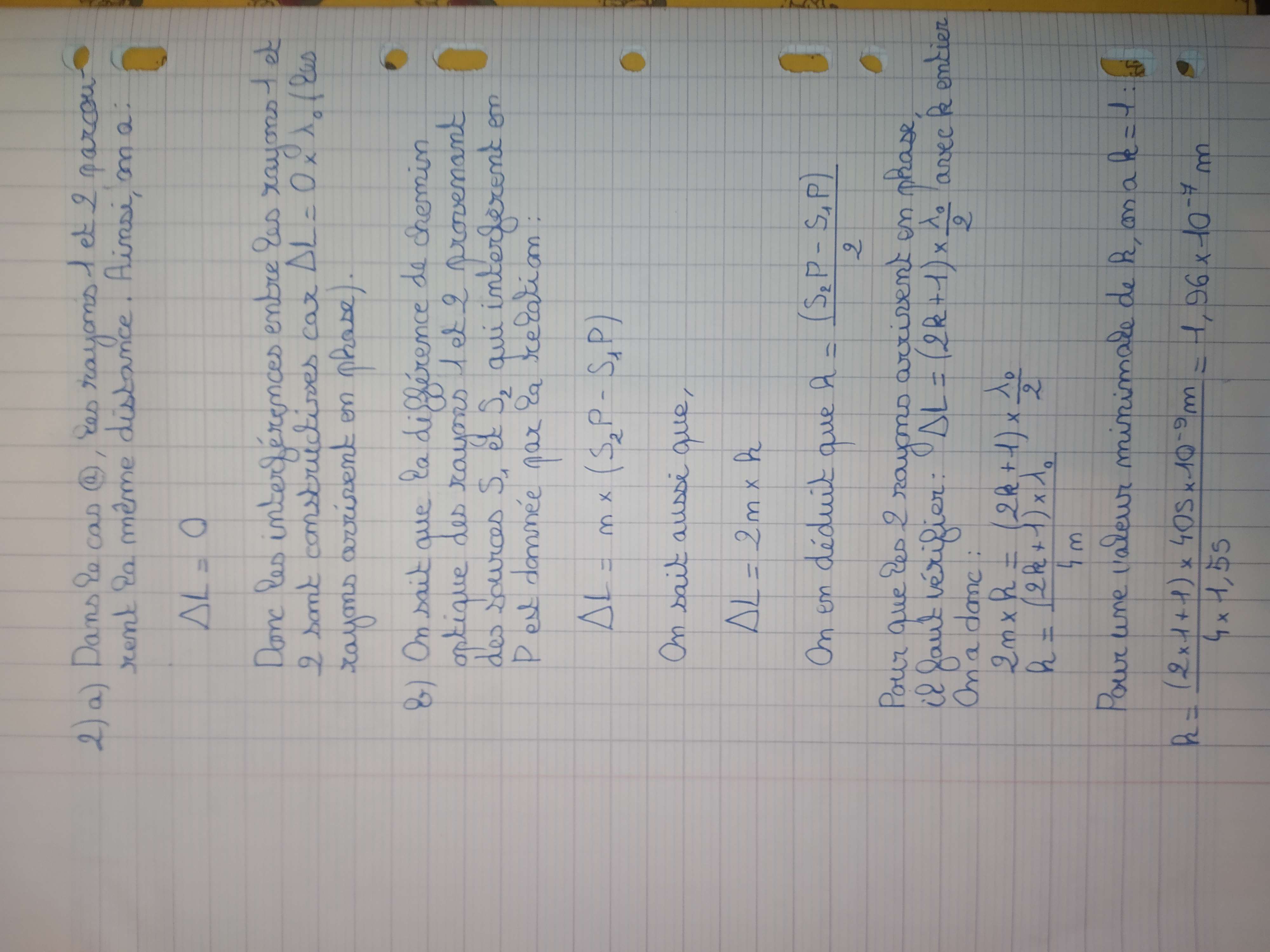 Mon professeur m'a donné des exercices bonus mais je ne suis pas sûr de mes réponses car c'est un sujet que je découvre. Je ne sait pas comment expliquer que des interférences se produisent sur le CD car les rayons sont parallèles et donc n'interfèrent pas en un point P. Peut-on considérer que les rayons sont suffisamment proches les uns des autres pour qu'ils interfèrent en un point ? Sinon je pense que ma rédaction n'est pas adéquates. Pourriez-vous m'indiquer si mes réponses sont correctes et rigoureusement rédigés.