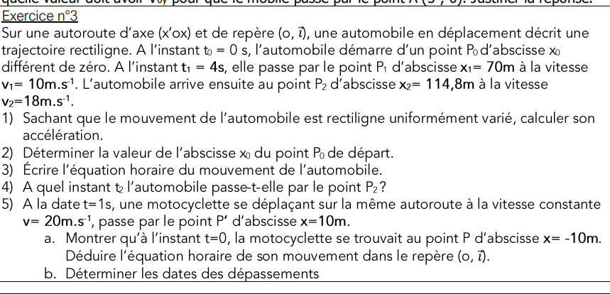 mon problème est la 2eme question j'ai déjà trouvé l'accélération a=2.5m/s^2 en utilisant v2^2-v1^2=2(x2-x1) je penser exploiter encore cette formule pour connaître la valeur xo mais le problème je ne connais pas v0 pourriez vous m'aider un peu