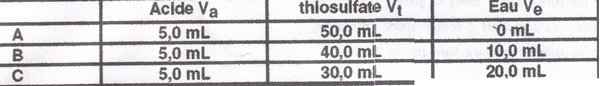 le protocole suivant sera réalisé 3 fois (A,B,C) . on Changera les volumes Vt et Ve de thiosulfate de sodium et d'eau utilisés en utilisant les valeurs du tableau ci dessous:
