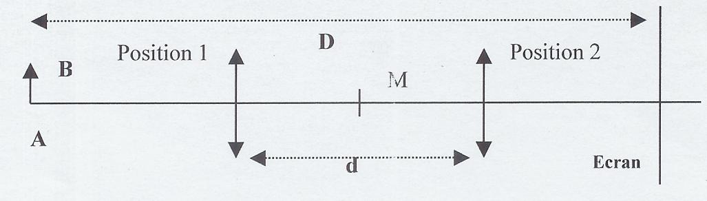 par le calcul on peut déterminer la position des deux lentilles avec la formule de conjugaison. on démontre que ces deux positions sont symétriques par rapport à M . En utilisant cette propriété , vous pouvez construire l'image avec première position en choisissant une focale , cette image se forme sur l'écran puis vous positionnez la deuxième position de la lentille (par symétrie ) et la nouvelle image se retrouve sur l'écran . Les deux images sont inversée mais elles ne sont pas de la même taille