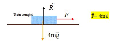 Texte : on schématise une rame de TGV comme étant constituée d'une locomotive et de trois wagons,tous les 4 de même masse ( m=10 tonnes chacun) ; la locomotive exerce une force de traction de 100 000 N. On néglige tout frottement.