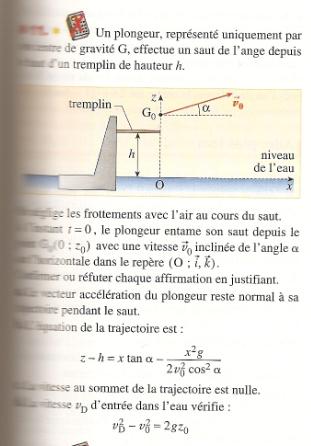 "A l'instant t = 0, le plongeur entame son saut depuis le point G0 (0 ; Z0) avec une vitesse Vo inclinée de l'angle alpha sur l'horizontale..."