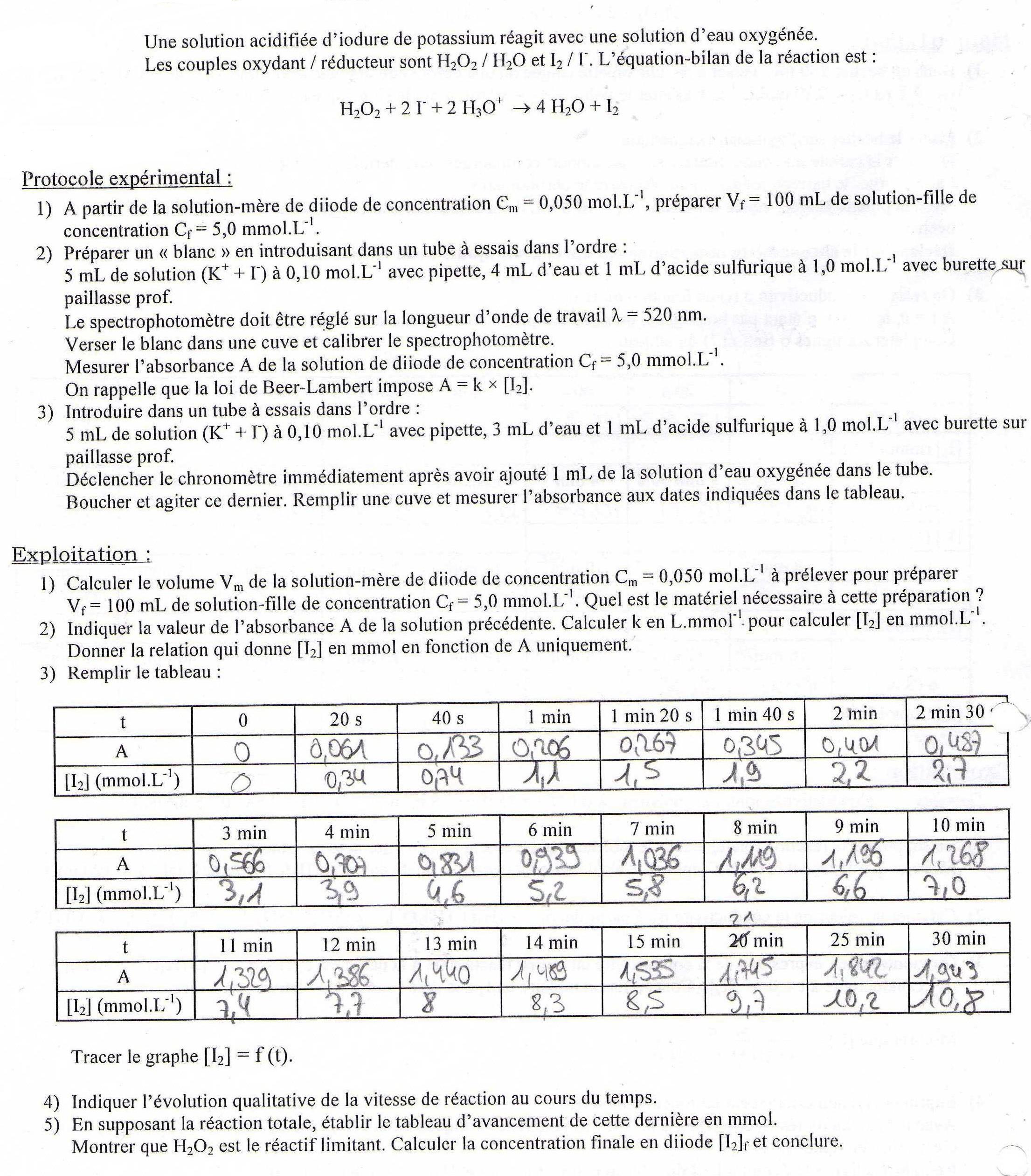Ah oui ! Donc : n(H2O2)= 0.1 mmol , n(I-)=0.5 mmol et n(H3O+)= 1 mmol.