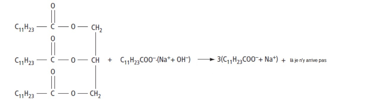 Pour l'équation suivante, cherchez, dans votre cours, ce que donne l'action de la soude sur un triglycéride : un savon, oui et .....