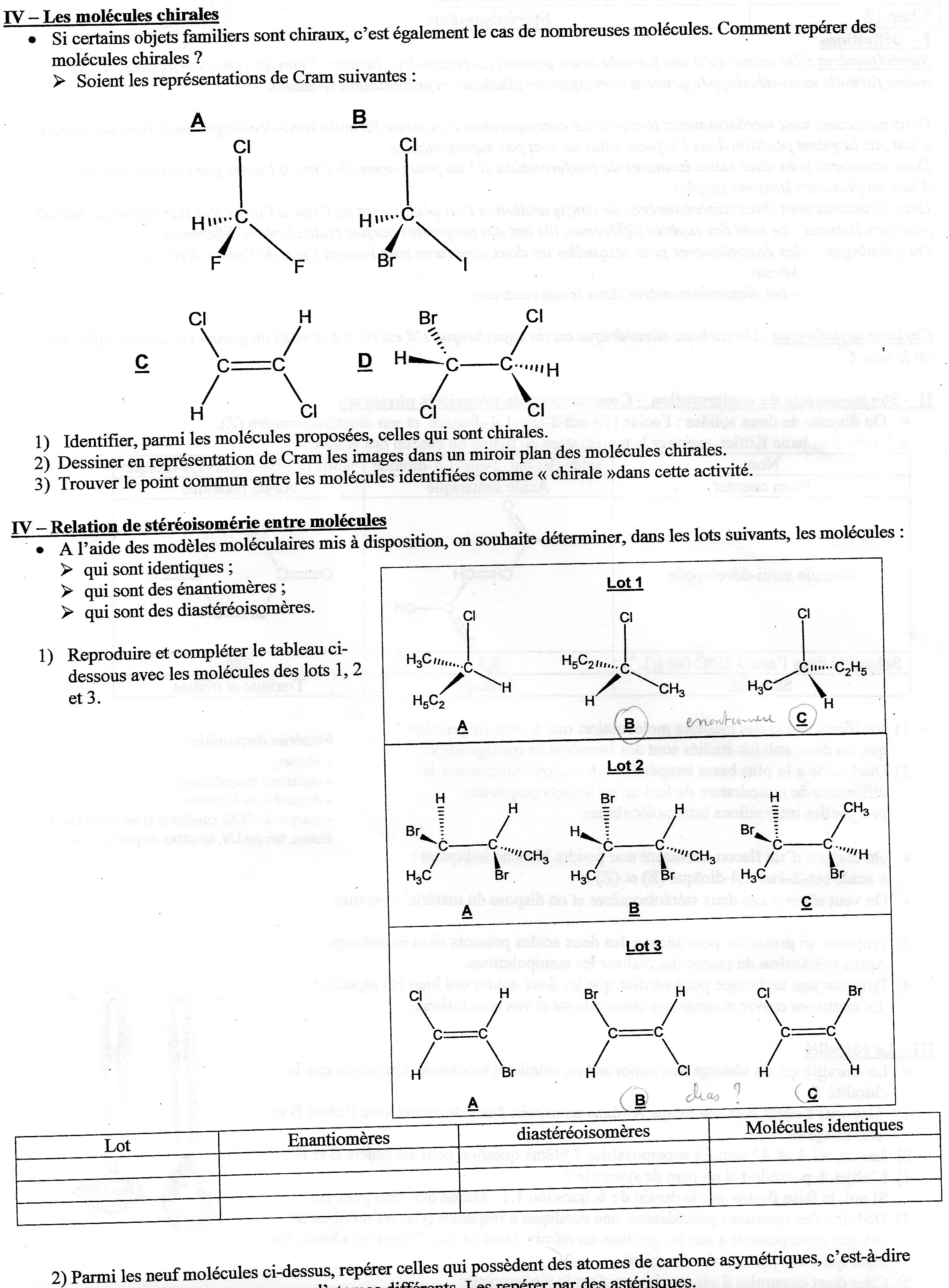 1-selon moi, les molécules B C D sont chirales. La B car c'est un atome C asymétrique. la C car c'est un diastereoisomere E. La molécule D quant a elle n'est pas superposable..( C'est d'ailleurs une des parties de ce chapitre que j'ai du mal à réaliser : essayer de superposer les molécules : ou tourner ... pouvez vous m'éclaircir ? )