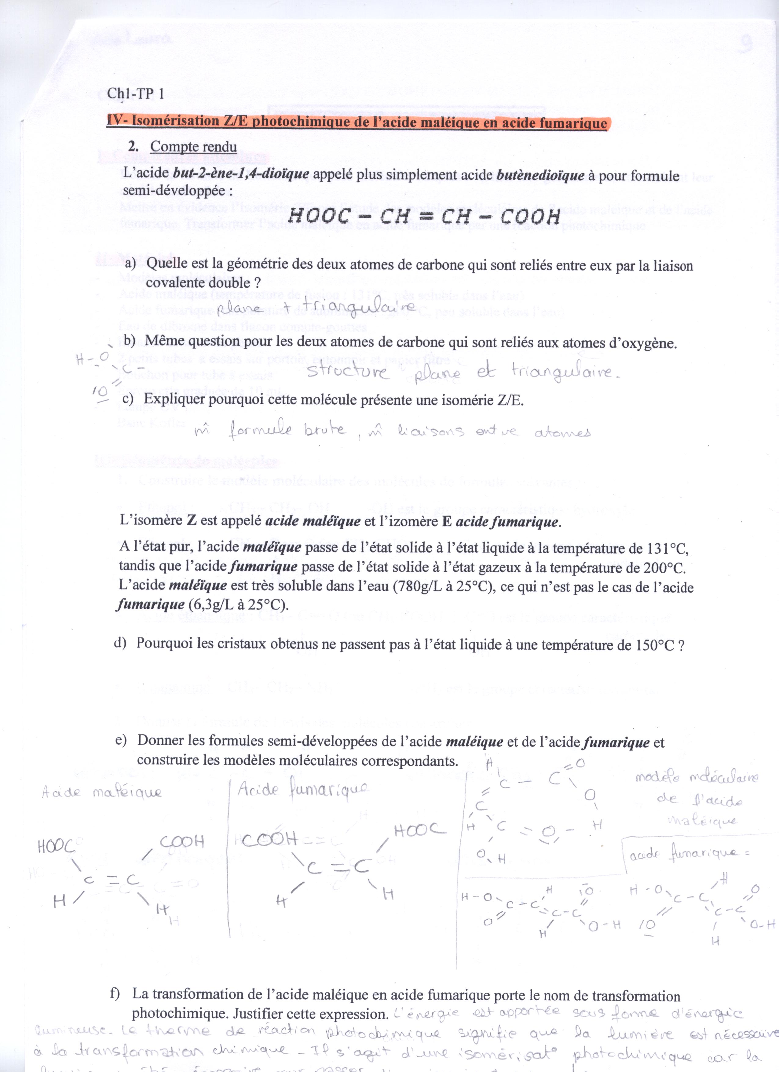En ce qui concerne la question d. Si vous avez obtenu des cristaux c'est que vous avez obtenu une espèce peu soluble dans l'eau, donc l'acide fumarique. Regardez alors la température de fusion de l'acide fumarique.