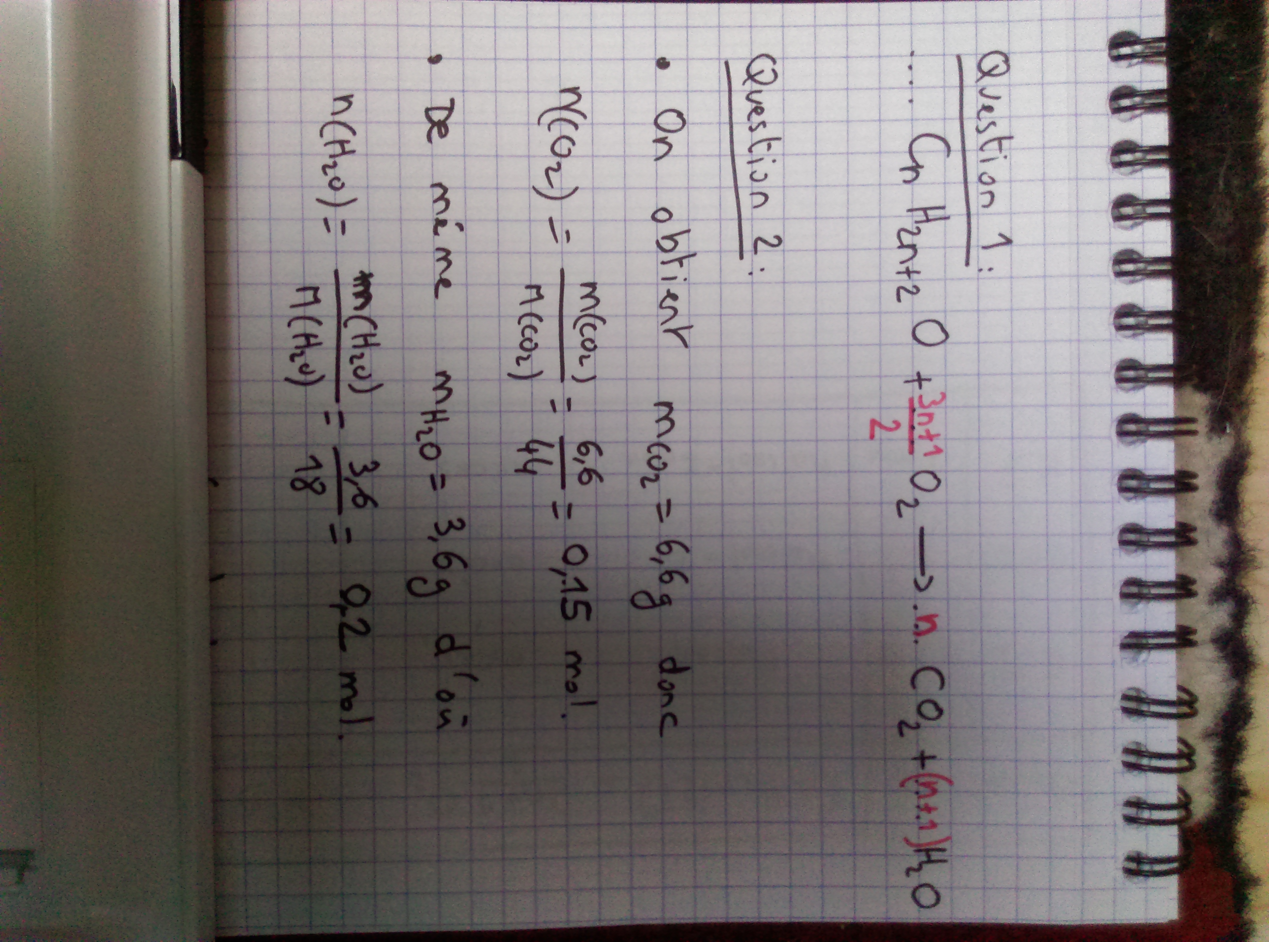 Pour la question 2 j'ai trouvé CO2 : 0.15 mol et H2O : 0.2 mol
