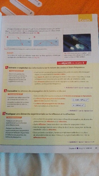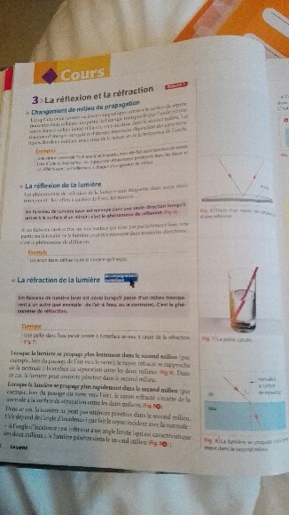 En ce début d'année scolaire, l'enseignant(e) de votre fille a choisi une progression qui, dans un premier temps, décrit les phénomènes de réfraction et de réflexion totale sans aborder les explications relatives à ces deux phénomènes. Cela suffit, par exemple, à comprendre le principe de la fibroscopie (lumière guidée par une succession de réflexions totales (figure 10 p 37)).