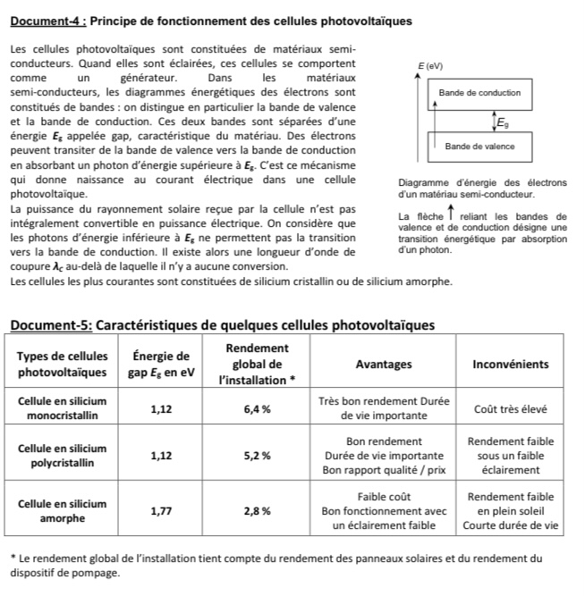 2. Pour cette installation de pompage solaire, on souhaite utiliser un matériau semi-conducteur dont la