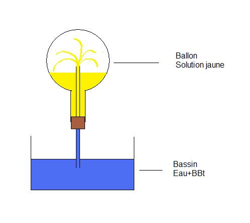 Et on le réchauffe jusqu’à ce qu’il commence à s’évaporer puis on renverse le ballon dans un bassin rempli d’eau et de BBT (le bleu de bromothymol).