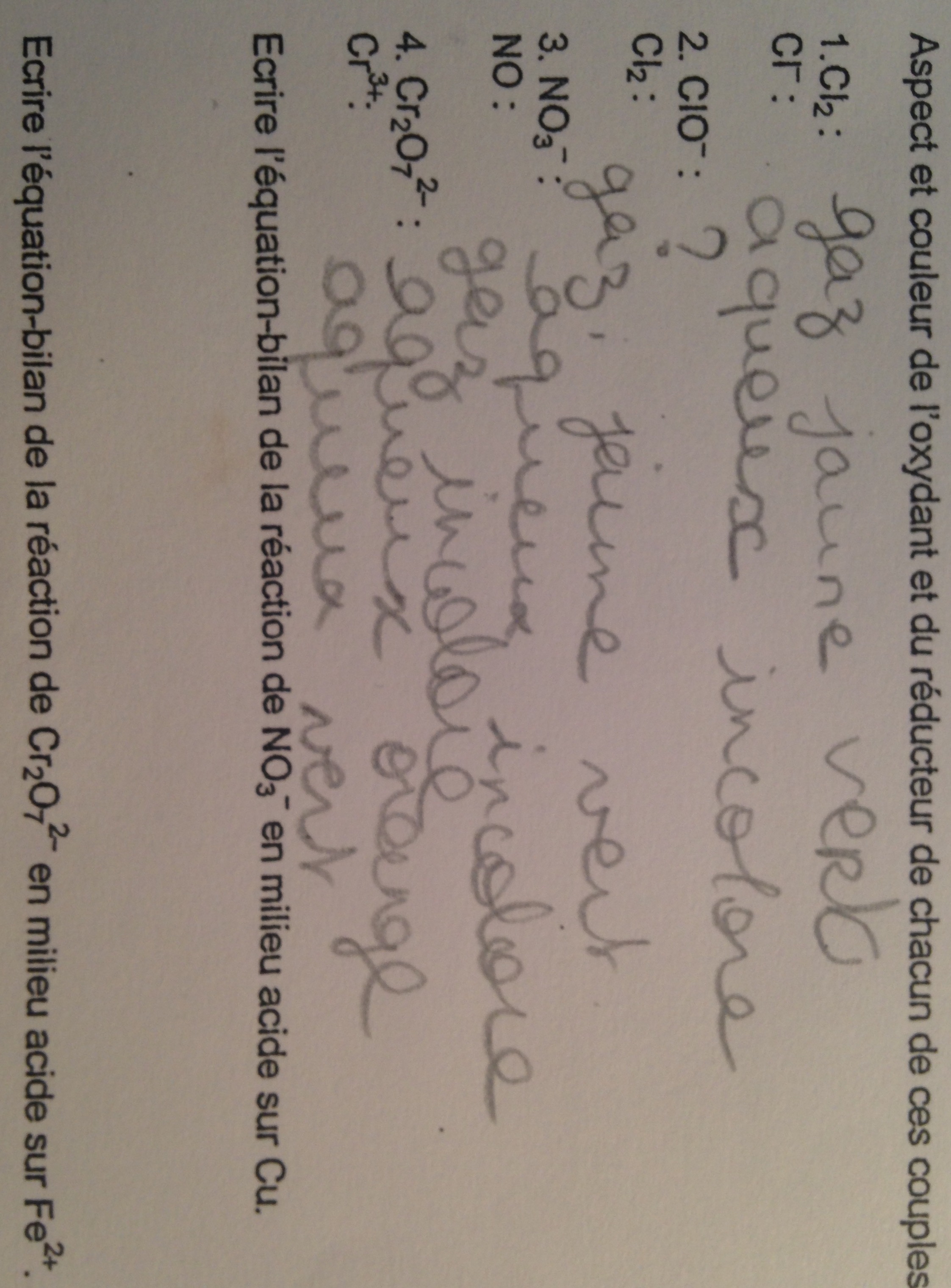 Donc mon premier excercice avec l'aspect et la couleur est juste? Car j'ai été étonné que Cl2 est un gaz de couleur jaune orange
