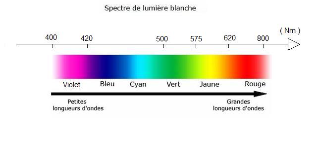 je trouve extrêmement bizarre que l'échelle du dessus ne soit justement pas à l'échelle ; en effet, il y a un plus grand écart entre 400 et 420 nm qu'entre 500 et 575 nm !