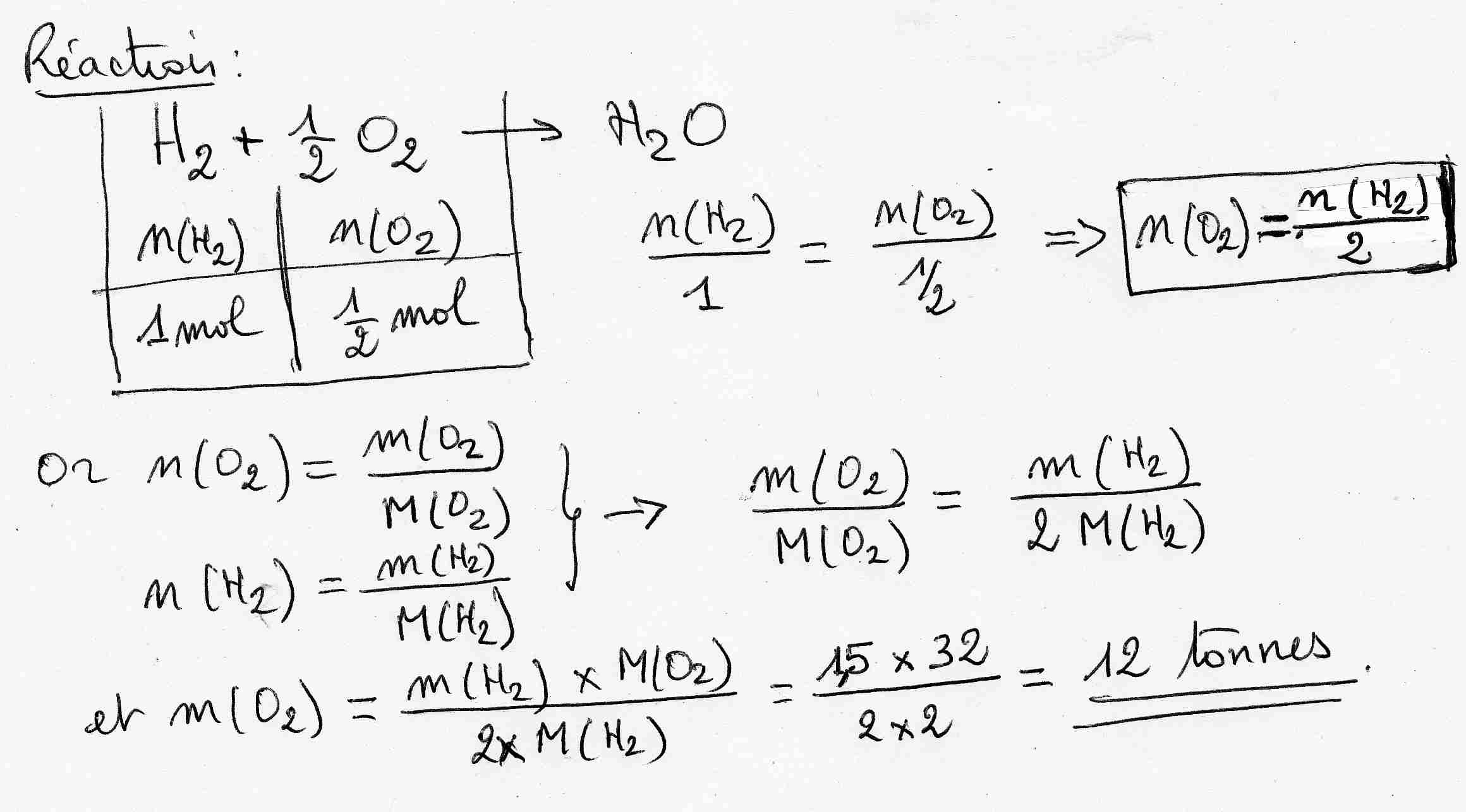 SoS(8) a écrit :Je ne suis pas d'accord avec votre résultat: premièrement il s'agit de dihydrogène et dioxygène, revoyez les masses molaires et de plus il faut écrire la synthèse de l'eau à partir du dihydrogène et du dioxygène. Le calcul donne alors 12 tonnes de \(O_2\)...ELISABETH SECONDE a écrit :Bonjour,