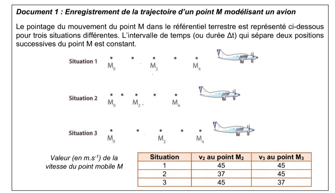 Le pointage du mouvement du point M dans le référentiel terrestre est représenté ci dessous pour trois situations différentes. L intervalle de temps (ou durée temps) qui separe 2 positions successives du point M Est constant