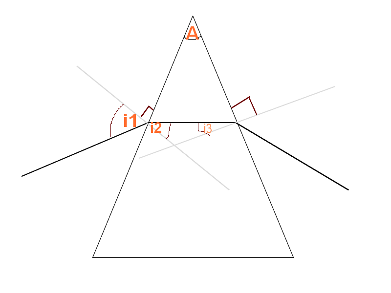 2-Sachant que l'angle au sommet du prisme vaut A=60°, montrer que le rayon réfracté arrive sur la deuxième face du prisme avec un angle d'incidence i3=A-i2.