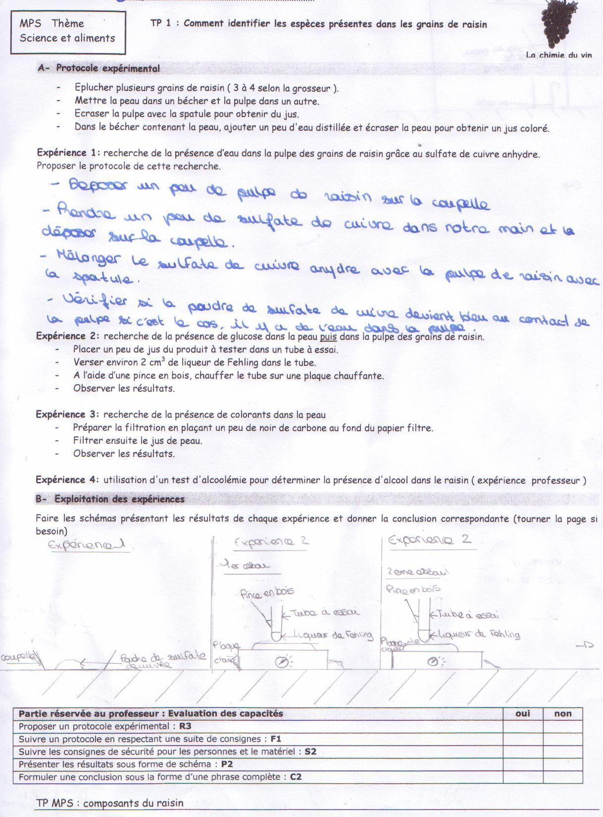 Vos schémas sont relativement corrects (il manque peut être quelques indications, la pulpe de raisin, les couleurs initiales et finales ... pourquoi y a-t-il deux schémas identiques pour l'expérience 2, dans ce même schéma où est le jus testé ?).