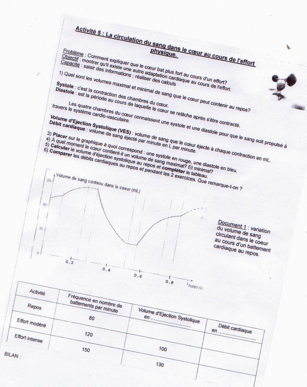 5) Pour le tableau , volume d'éjection systolique en mL , et au repos il est de 70 mL mais je ne penses pas que ce soit ça mais après je ne sais pas trop ...