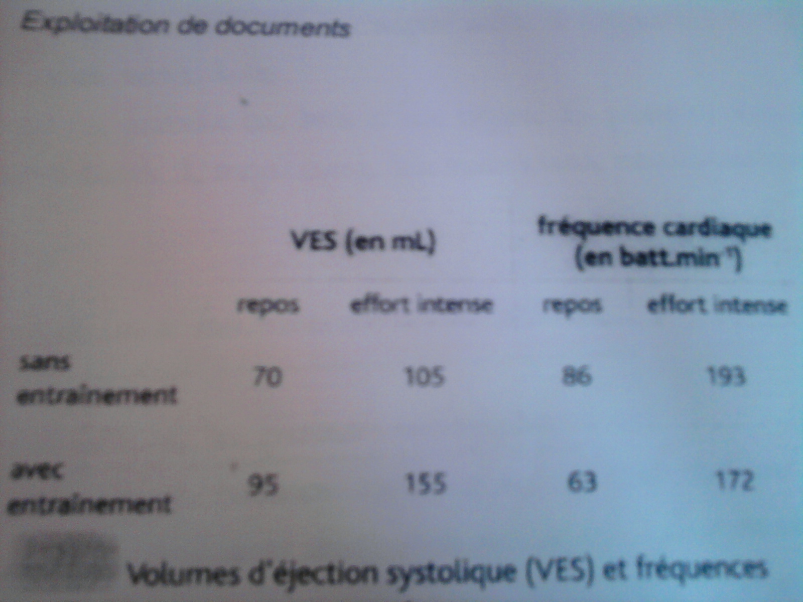 3) Indiquer les effets de l'entrainement sur la fréquence cardiaque et sur le volume d'éjection systolique .