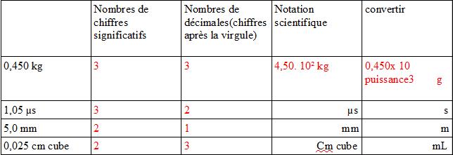 * pour l'écriture scientifique, faites attention au signe de la puissance de 10 : les élèves se trompent souvent entre 10^2 et 10^(-2). Ici, vous avez écrit 4,50 x 10^2 kg. Cela fait donc 4,50 x 100 kg, c'est à dire 450 kg. Est-ce ce que vous aviez en première colonne du tableau ? En règle générale, si vous hésitez entre la puissance positive et la puissance négative, écrivez le résultat comme vous le sentez, et regardez après si c'est petit ou grand, et si vous aviez au départ quelque chose de petit ou grand.