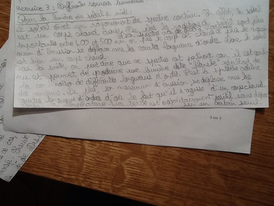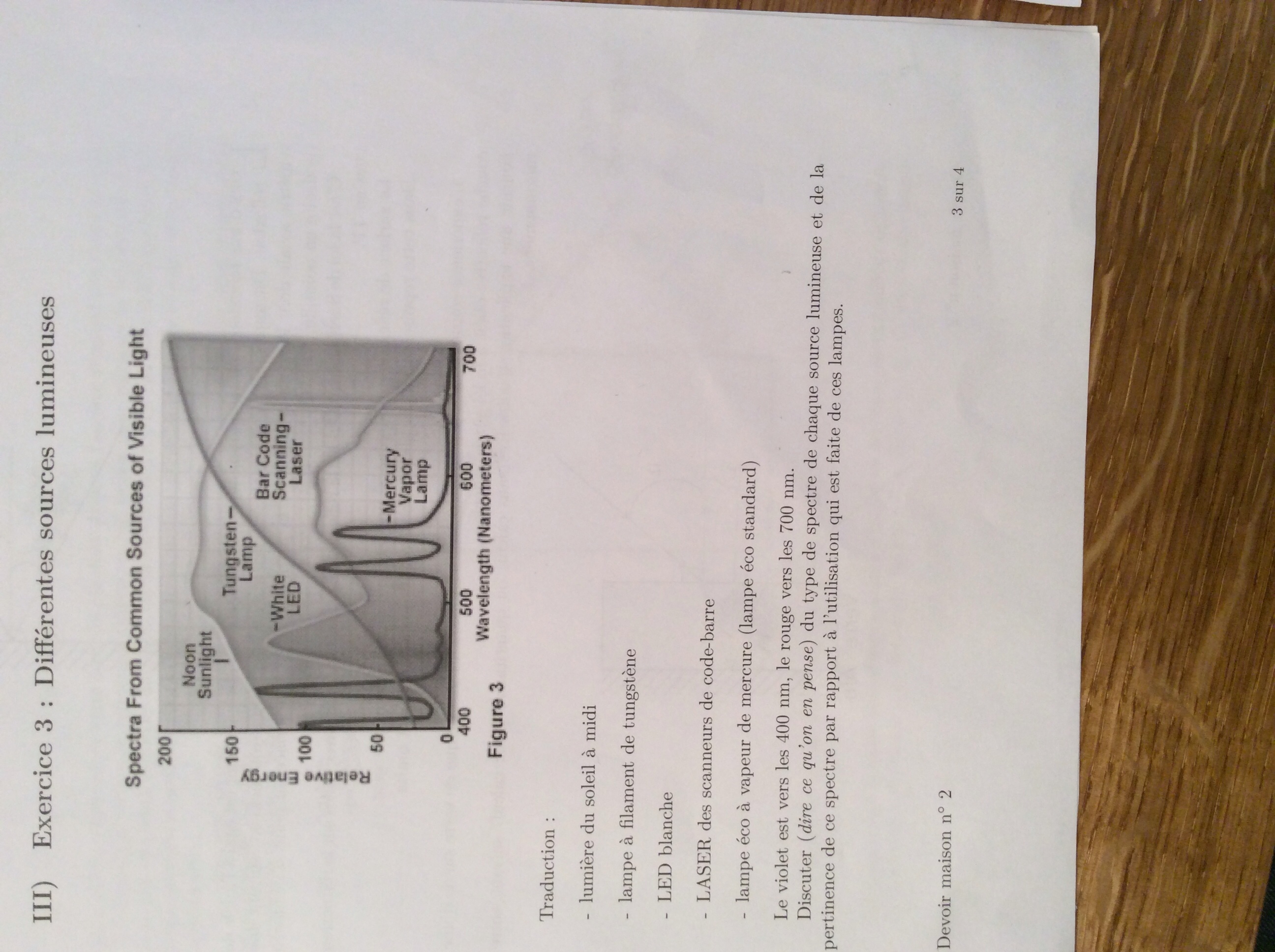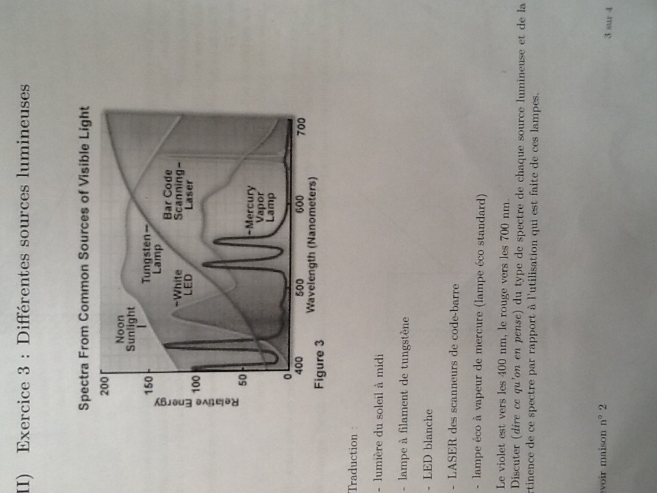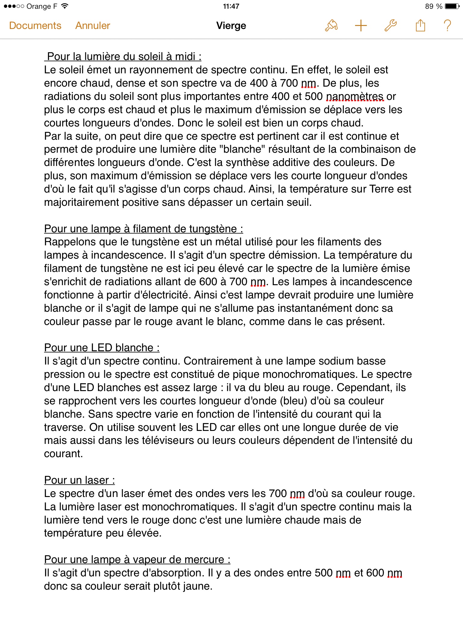 1) Dans la consigne j'aimerais savoir ce que le professeur entend par "pertinence de ce spectre par rapport à l'utilisation qui est faite de ces lampes". Est-ce que dans le paragraphe du soleil c'est mon histoire de température qui vient justifier cela et dans mon paragraphe de la LED l'histoire du téléviseur ? Si c'est cela, j'aimerais savoir si c'est deux exemples sont corrects et quel pourrait être l'exemple d'utilisation d'une lampe à filament de tungstène .. ?