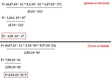 Ok donc avec F= (G x Me x Mp) / d2 ( G = 6,67.10^-11 g ; Me = 9,1*10^-28 g ; Mp = 1,67*10^-24 g et d = 50 pm ) je convertie les g en kg et la distance en metre puis c'est tout?? Je marque le resultat je fais pareil avec la Terre et le Soleil et c'est fini?