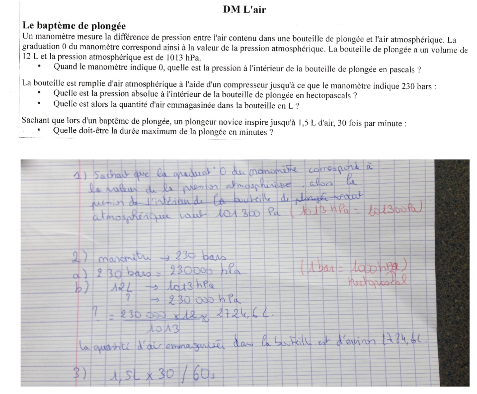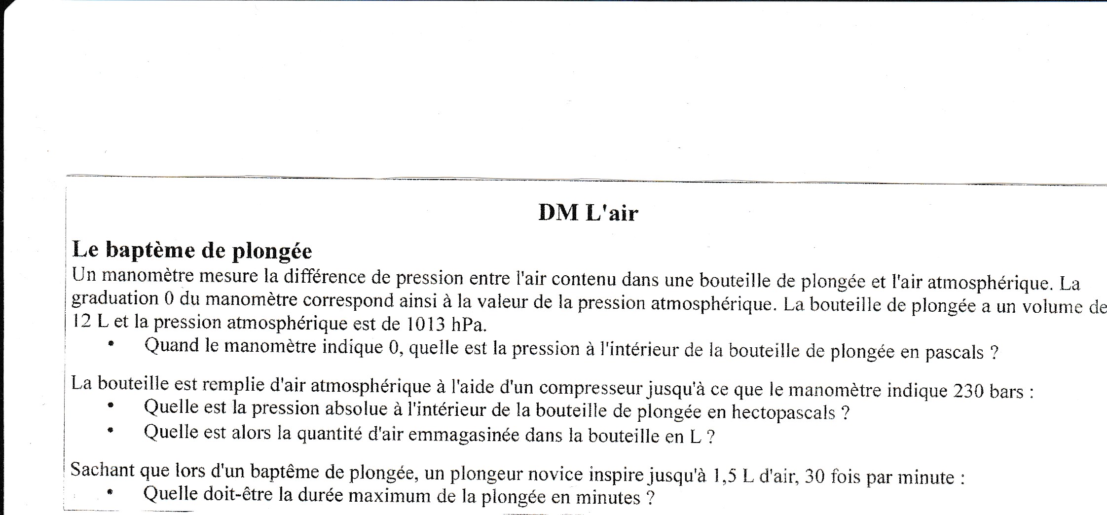 2.b votre raisonnement est faux ; en effet , le volume du gaz et sa pression ne sont pas proportionnels : vous ne pouvez pas utiliser un tableau de proportionnalité ; de plus vous avez commis une deuxième erreur en effet pour V = 12 L, la pression vaut 230 bars ; on cherche le volume occupé par cet air pour 1013 hPa.