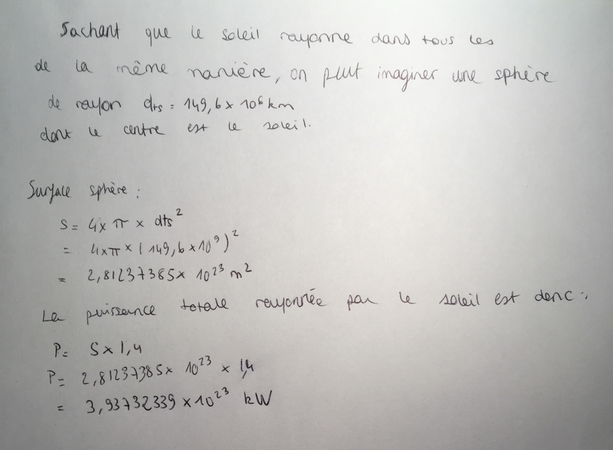 La puissance rayonnée par le soleil sera donc égale à la surface multipliée par la puissance surfacique.