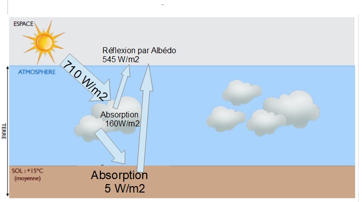 Après avoir atteint la Terre, le rayonnement solaire peut être renvoyé vers l’espace par le phénomène d’albédo (l'albédo est une grandeur physique sans unité caractérisant la capacité d'une surface solide, liquide ou gazeux à réfléchir tout rayonnement lui parvenant)ou être absorbé par l’atmosphère (qui correspond aux gaz comme la vapeur d'eau, le dioxygène et l'ozone présent dans l'atmosphère absorbant dans le doc 22,5% du rayonnement solaire.