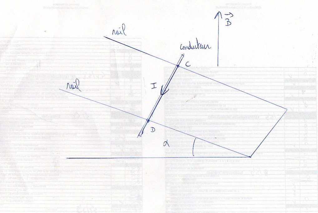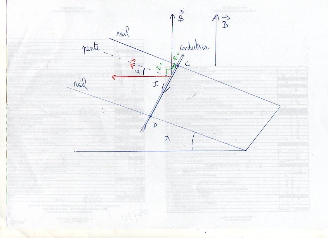 je sais que alpha correspond à langle entre le conducteur et le vecteur B cependant je ne vois pas dans quel plan prendre le conducteur pour qu il fasse un angle de 90 degres avec B puisuqe le plan est incliné..