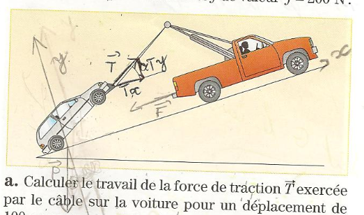 Une dépanneuse tracte une voiture de masse m = 980 kg avec un câble incliné d'un angle
