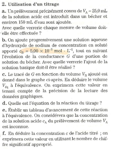 Bonjour, dans UTILISATION D'UN TITRAGE e) on me demande : 1) Calculer CA donc à mon avis c'est CA * VE -xE=0 et CA=xE/VE Est-ce la bonne formule? Si oui je trouve 5*10 puissance -3