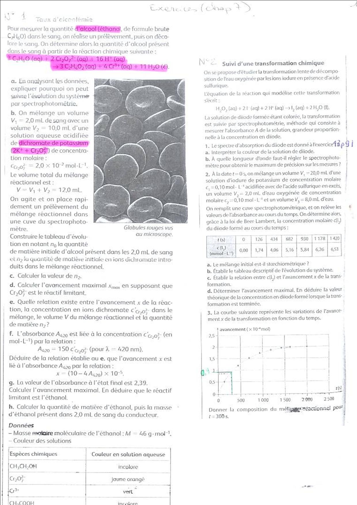 Pour la question b, il ne faut pas mettre de valeur dans le tableau car on vous dit "en notant n0 la quantité de matière initiale d'alcool présent dans les 2,0 mL de sang et n2 la quantité initiale en ions dichromate introduits dans le mélange réactionnel". Utilisez ces notations d'autant plus que le calcul de n2 n'est demandé qu'à la question c.
