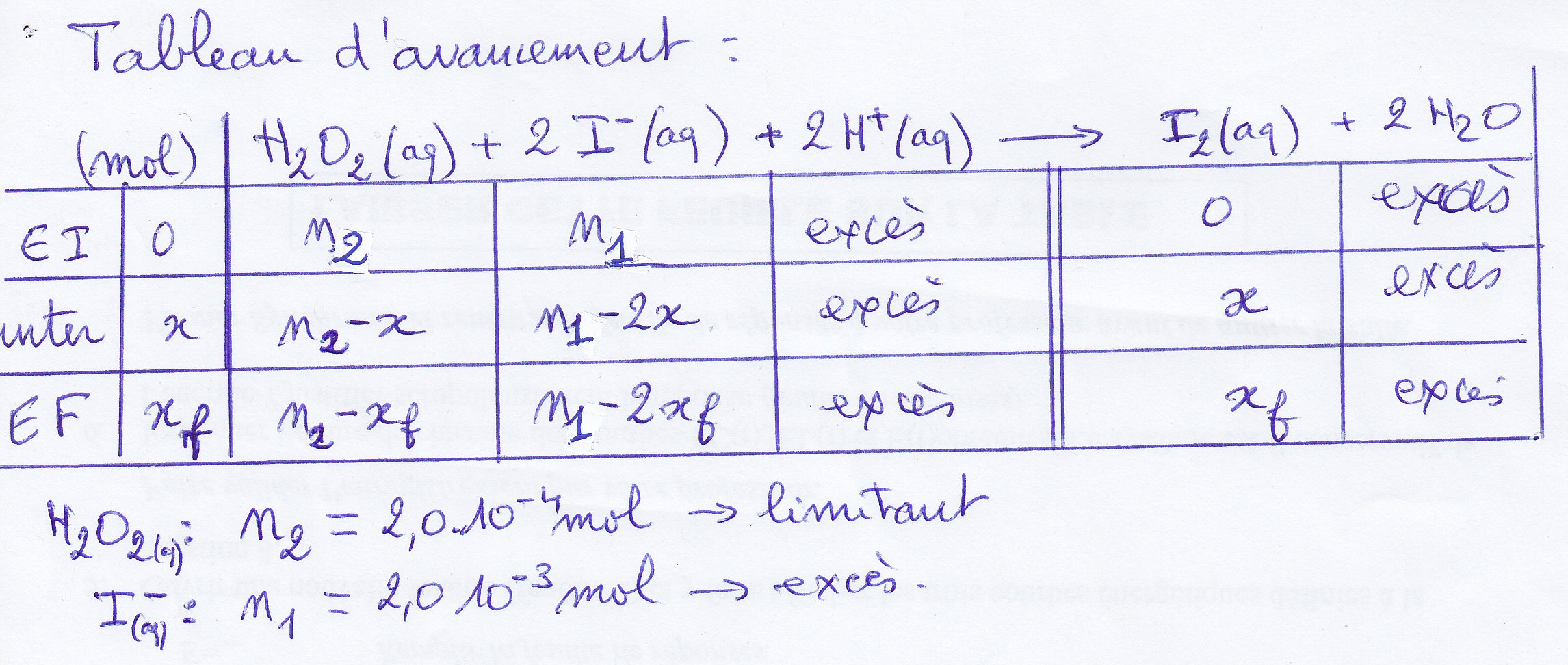 Je suis d'accord avec les quantités de matière initiale en eau oxygénée et ions iodure mais attention, il faut écrire n(I-) et non n(2I-) car il s'agit de la quantité d'ions iodure, le 2 étant lié à l'équation et pas à cette quantité.