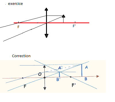 Imaginez un instant que la lentille représentée ne soit pas là. Les rayons se propagent donc rectilignement. Ainsi on peut choisir deux rayons utiles OA et FA qui se propagent tous les deux rectilignement et qui vont tous les deux se croiser en A (principe d'une image). Ainsi les rayons OA et FA sont rectiligne (pas de lentille) et se croisent en B.