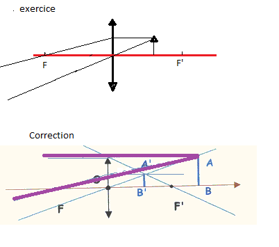 De plus, je ne comprends pas pourquoi les rayon FA et le rayon parallèle à l'axe optique et passant par le point A sont droits et ne sont pas déviés malgré qu'ils passent par la lentille? Comment pouvons-nous nous baser sur ces rayons (qui sont incorrects) pour tracer les autres rayons, cela ne me parait pas très logique ?