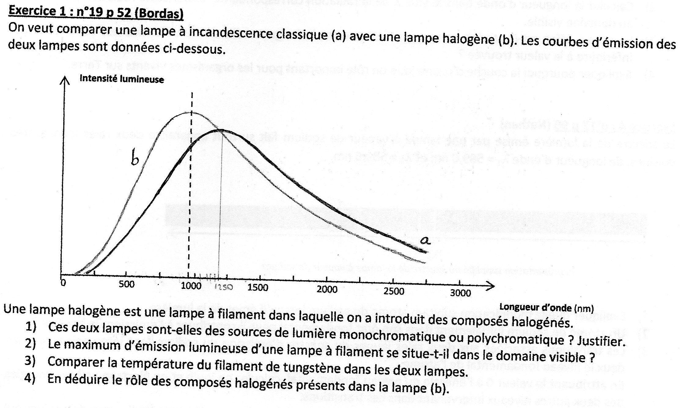 On me demande ensuite de comparer la température du filament de tungstène dans les deux lampes, ce que j'ai fait grâce à la loi de Wien: