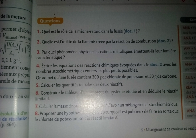 Pour la question 5 au sujet du calcul des quantité de matière initiales des réactifs vous devez utiliser la relation \(n=\frac { m }{ M }\).