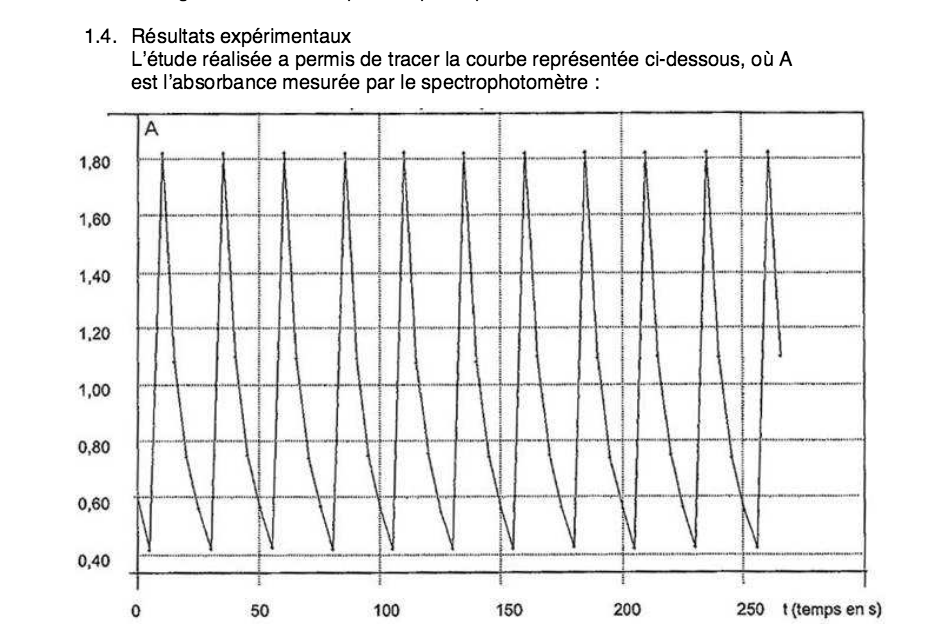 - Montrer en utilisant le graphique ci-joint donnant l'absorbance du mélange en fonction du temps que la quantité de matière de diiode formée puis consommée au cours de chaque cycle vaut :